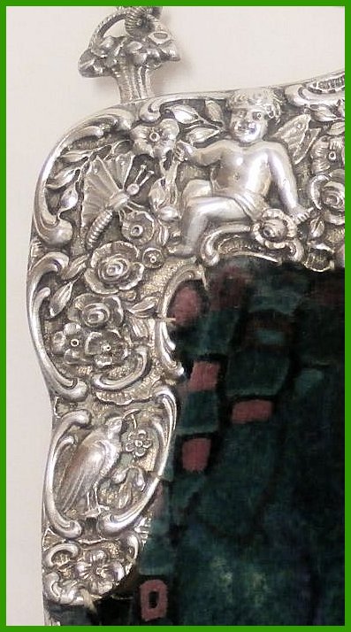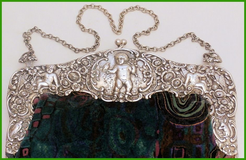 Eine hochelegante Beuteltasche. Bügel und Kette in Silber 800 - 260 Gramm. Getrieben, ziseliert, und gepunzt.