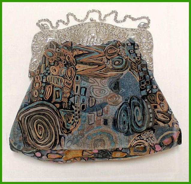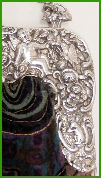 Den Beutel haben wir aus feinem Baumwollsamt neu angefertigt. Das Innenfutter in rotem Satin. Höhe 24cm. Breite 25cm. Kette 48cm. |