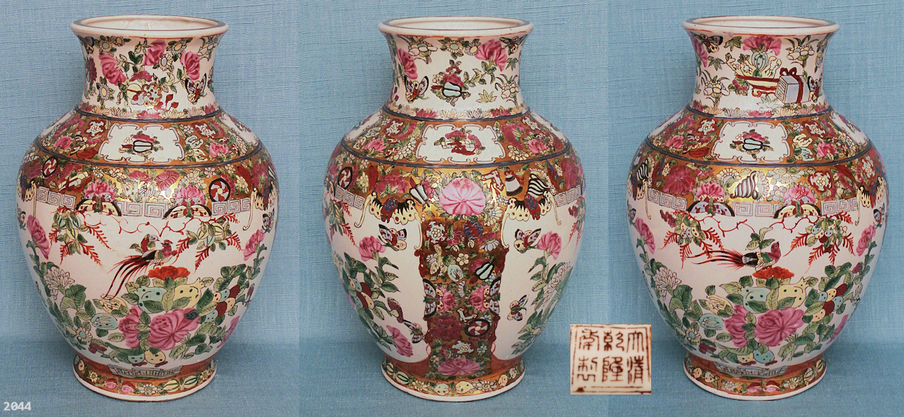 A porcelain baluster vase. Depictions of lucky and life symbols on a gilded background and in reserves. Painted with heightened enamel colors. Reserves and underside inscribed. China, circa 1950. Height31 cm. Diameter 22,5 cm. The price SFR 1800.-- |
