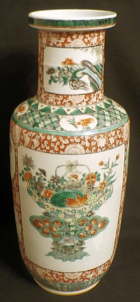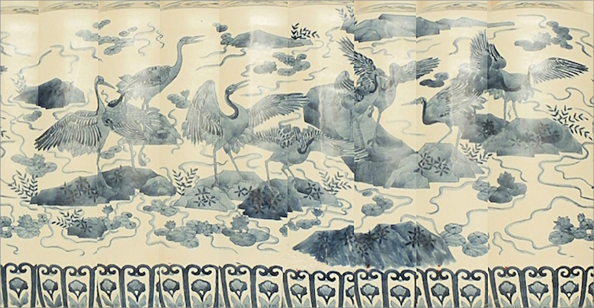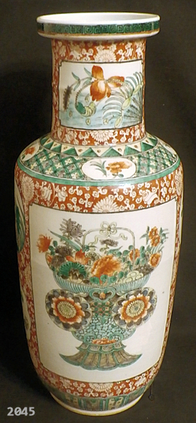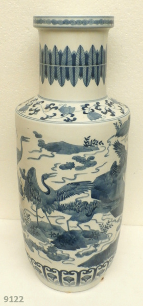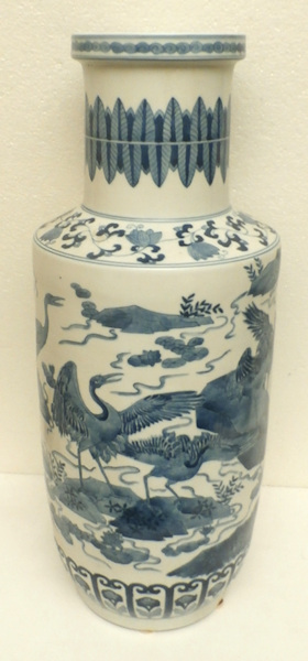 A rare rouleau vase depicting a colony of cranes on overgrown rocks, in a lake with blooming lotus flowers. China, Kangxi period, probably early 18th century. Height 53cm diameter 21cm. - - - - - - - - - - - - - - - - - - <> Price on request. <> |