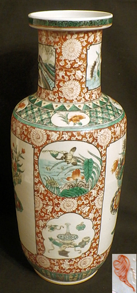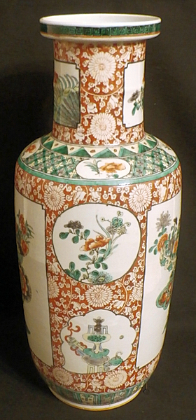 A large porcelain rouleau vase. The vase features depictions of symbols of good fortune and life. The underside bears an Artemisia leaf mark. China, circa 1950. Height 44 cm. Diameter 18 cm. - - - - - - - - - - - - - The price SFR 1200.-- |