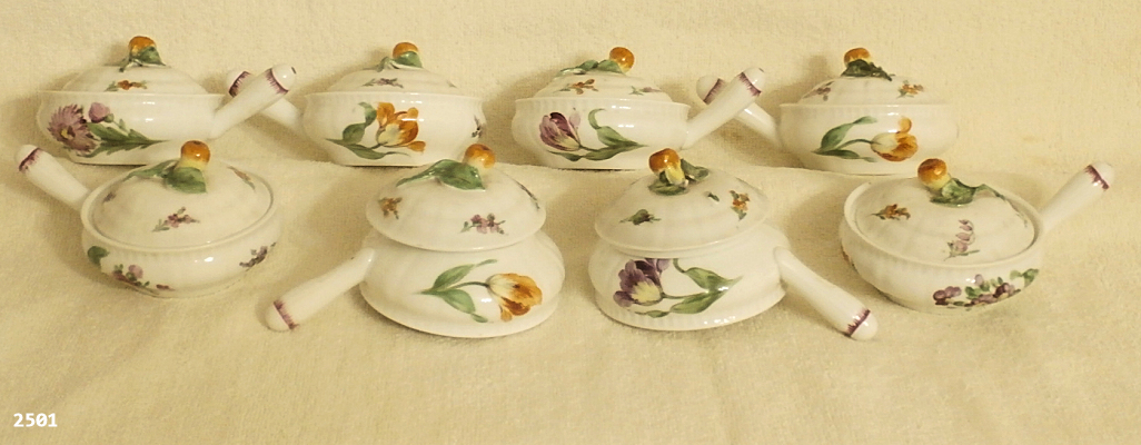 A set of 8 small bowls with handles and lids. Dimensions: Diameter 9 cm. Height 3.5 cm (6.5 cm with lid) Handle 4 cm.