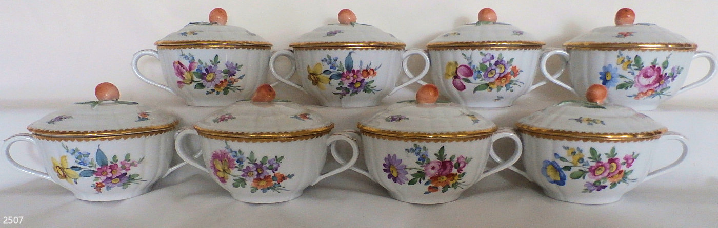 A set of eight rare dessert bowls with saucers and lids. Dimensions: Diameter 11 cm. Height 6 cm, 10 cm with lid. Plates 17 cm diameter.