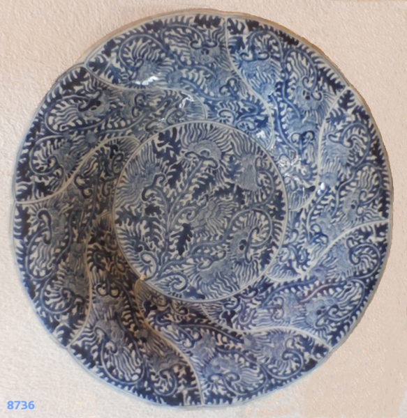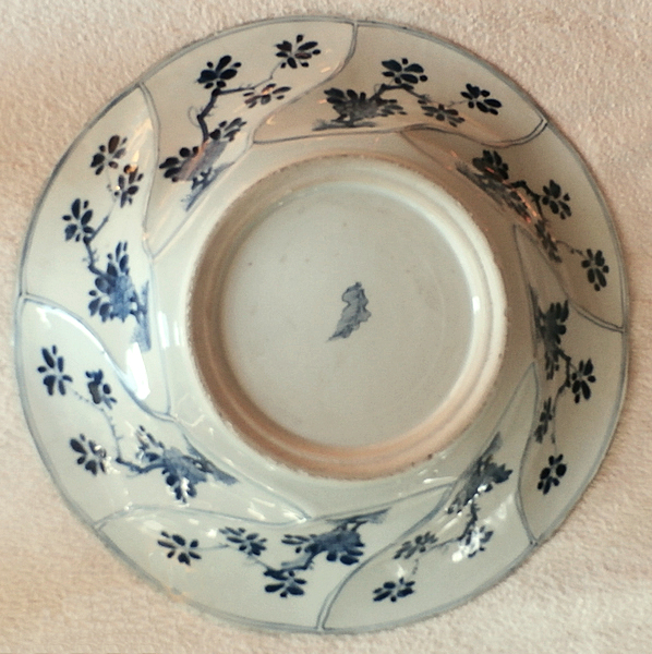 Reverse: Fruit tree with blossom and Artemisia leaf mark. China, Kangxi period, probably before 1700. Diameter 39 cm, rim height 6 cm. |