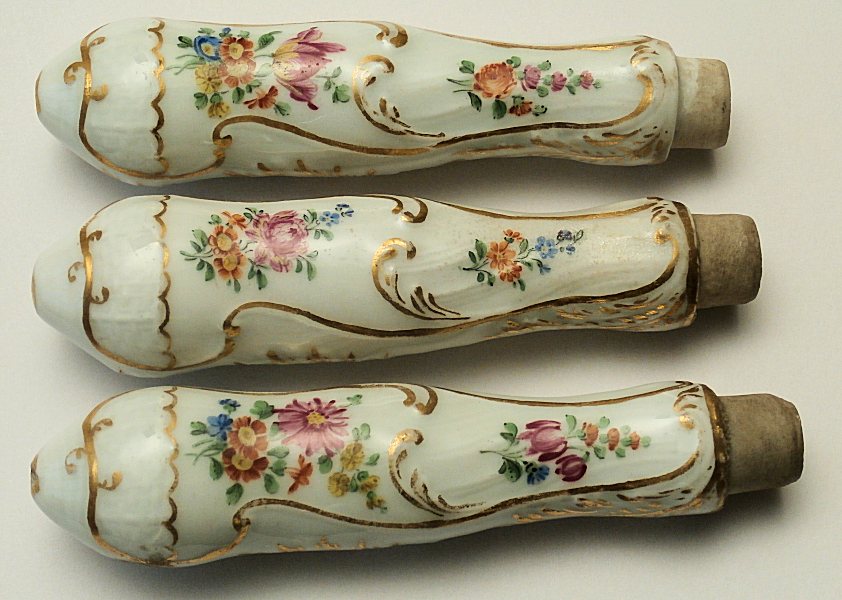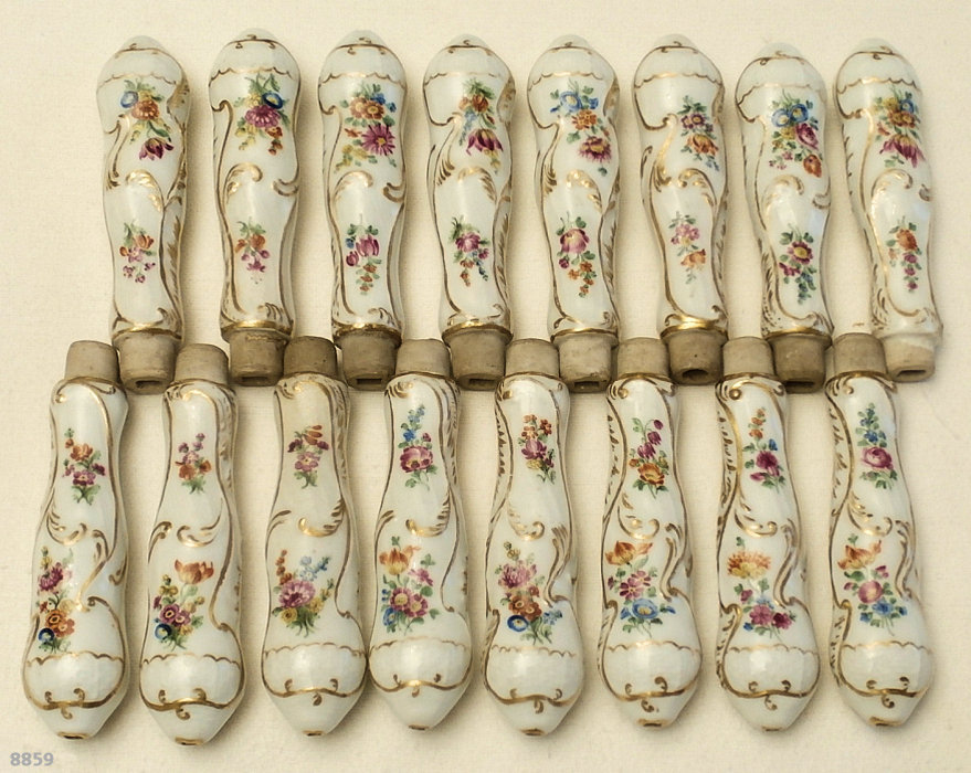 A set of 16 very rare porcelain table knife handles, without blades. Probably Meissen or Nymphenburg. 18th century. According to tradition, they came from Dresden. Handle length 9 cm. New blades can be obtained upon request. The price for the set is CHF 2500.-- |