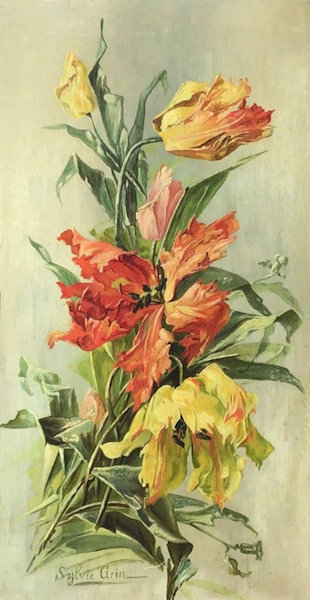 A masterpiece, oil on cardboard.A bouquet of tulips. Signed: SYLVIE GRIN The frame is punched in burning technique, Image size 29x54 cm frame size 43x68 cm |