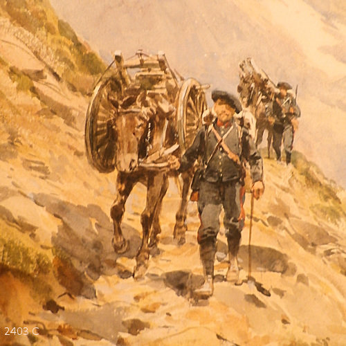 Pierre Paul Comba was born in 1859 in Nice, France, and died there in 1934. His father, also named Pierre Paul, lived from 1834 to 1872 and worked as a painter of military subjects, watercolorist, draftsman, and illustrator. His talented son followed him and worked for a time as a military painter with the Alpine Hunter units. The paintings presented here were created between 1888 and 1916. The paintings are in their original frames. Image size 19 x 34 cm. Frame size 34 x 50 cm. Price: CHF 1200.-- / 3