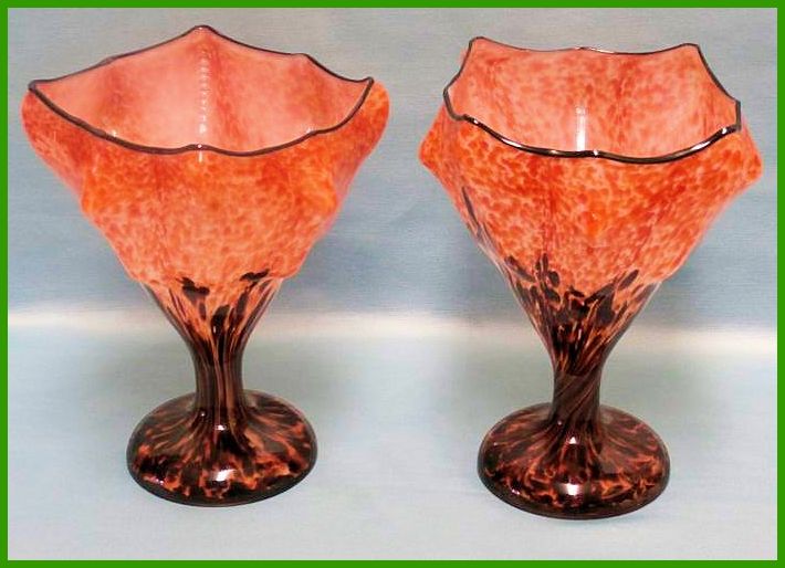 | Eine grosse Trichtervase mit blattförmigem Standfuss. Aus grünem Glas geblasen. Verziert mit Spirale, 4 Noppen und Wellenband. Murano vor 1900. Höhe 27,5 cm. Preis auf Anfrage. | - - |