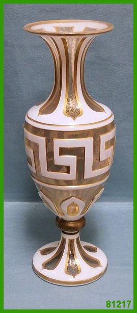Eine sehr feine | hochelegante Vase aus der Epoche des Directoire. In farblosem Glas geblasen und weiss überfangen. Die Reserven ausgeschnitten, mit einem endlos- Wurmmuster in Gold versehen und alle Kanten vergoldet. Frankreich um 1800. Höhe 33,5 cm. Durchm.10,5 cm. Preis auf Anfrage. |
