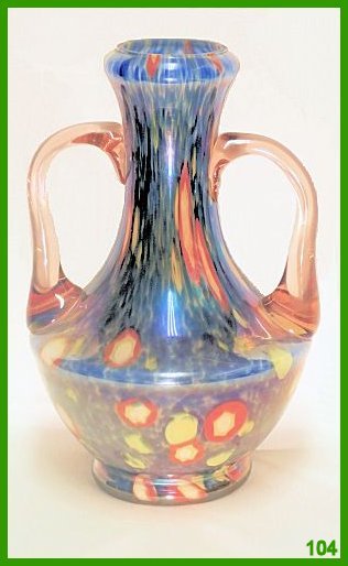 Eine Henkelvase aus Glas mit mehrfarbigen Murrinen geblasen. Eine Meisterarbeit aus dem Murano der 1930er Jahre. Masse: Höhe 23,5cm. Durchmesser 15cm. Preis auf Anfrage. | - - |
