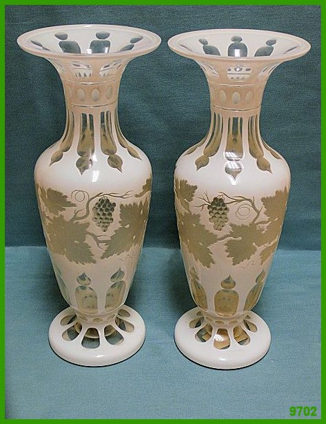 Ein seltenes | gegengleich gearbeitetes Vasenpaar mit Weinlaubdekor. Klarglas, weiss überfangen. Die Reserven ausgeschnitten und poliert. Das Weinlaub mattgeschliffen. Aus der Epoche des Biedermeier, Böhmen um 1820. Höhe 31 cm. Durchm.11 cm. Preis auf Anfrage. - - -