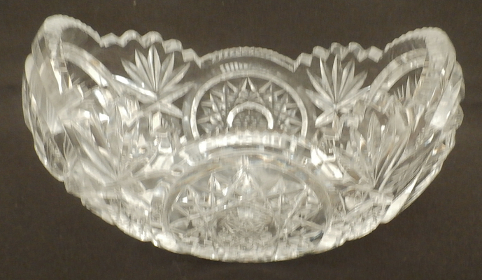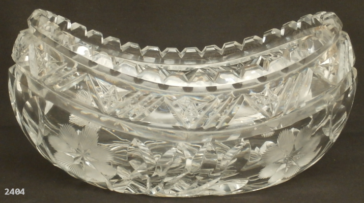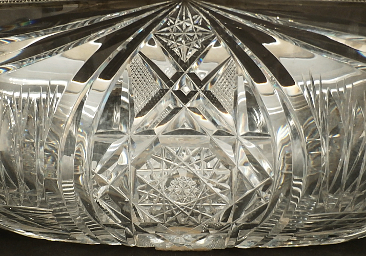 In between, pointed leaves and star patterns, cut and polished to a high shine. Bohemia, from the period around 1900/20. A masterpiece of glass cutting. The dimensions: Length 17 cm. Width 9.5 cm. Height 9/7 cm. The price SFR 1200. -- |