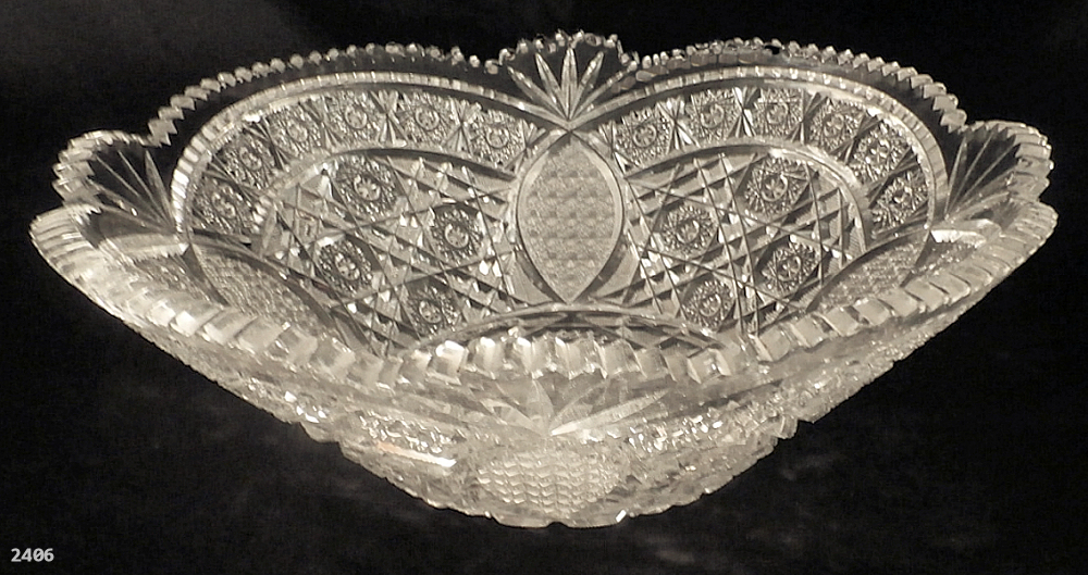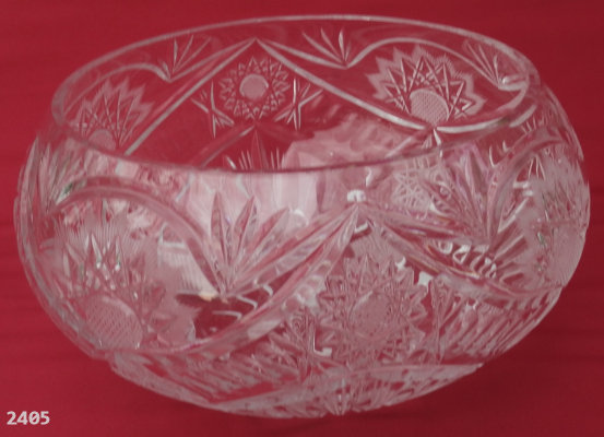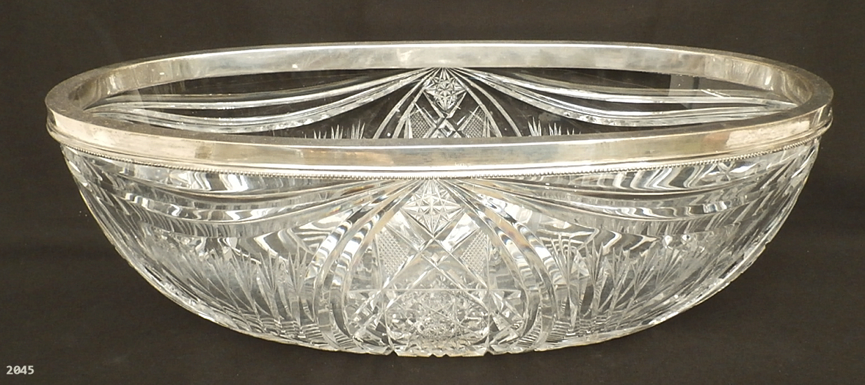 In between are reserves with a pointed grass pattern on a wavy background. The rim of the bowl is set in silver. Bohemia around 1900/20. A masterpiece of glass cutting. The dimensions 40 X 20 cm. Height 15 cm. The Price SFR 1800.-- |